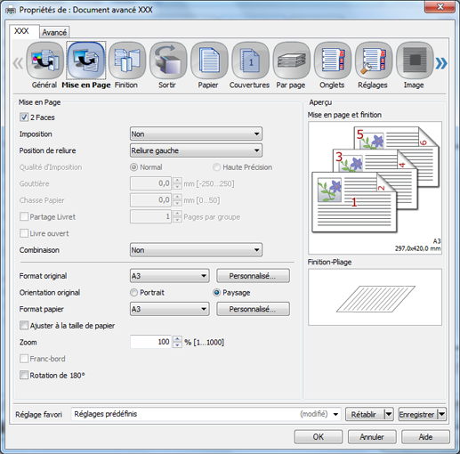Lors de la configuration du pilote d'imprimante, assurez-vous d'avoir supprimé les réglages précédents des différents éléments des onglets Mise en Page, Finition, Couvertures, etc.
