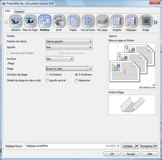 Cliquez sur l'onglet Finition et définissez Pliage et Direction de pliage.