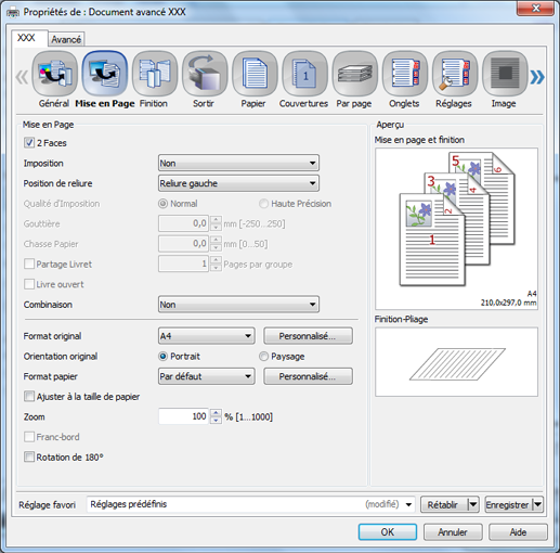 Lors de la configuration du pilote d'imprimante, assurez-vous d'avoir supprimé les réglages précédents des différents éléments des onglets Mise en Page, Finition, Couvertures, etc.