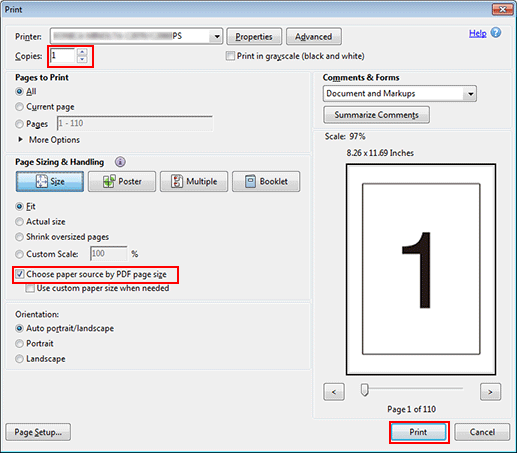 Entrez Copies sur l'écran Impression, puis sélectionnez Sélection source papier par format de page PDF et cliquez sur Impression.