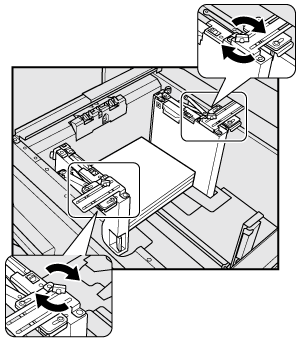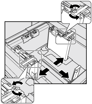 Explication supplémentaireTournez les deux boutons de fixation des guides latéraux des plaques-guide latérales dans le sens contraire des aiguilles d'une montre pour les desserrer.