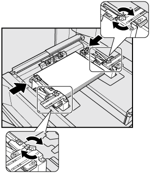 Explication supplémentaireDéplacez les bords supérieurs des plaques-guide latérales pour aligner les guides sur le papier, puis tournez les deux boutons de fixation des guides latéraux dans le sens horaire pour fixer les guides.