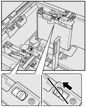 Attention de bien aligner la plaque-guide latérale et la plaque-guide arrière sur le papier à onglet. Si l'écart entre les deux est égal ou supérieur à 1 mm ou si le papier est oblique dans le magasin, l'alimentation risque d'être entravée.