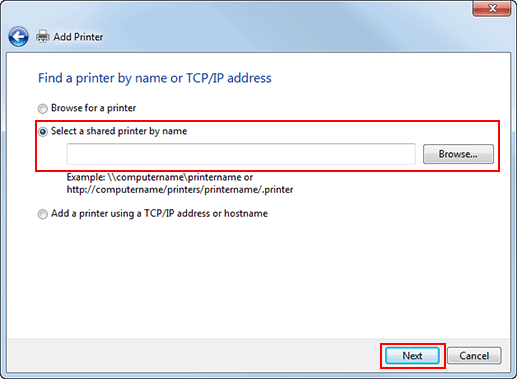 Dans le champ Sélectionner une imprimante partagée par son nom entrez au format suivant l'URL de la machine et cliquez ensuite sur Suivant.
