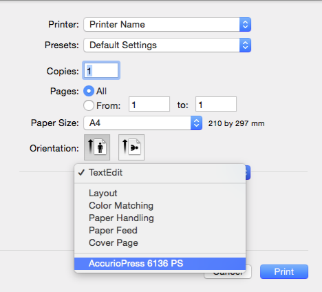 Spécifiez la commande d'impression de l'application et sélectionnez le nom de l'imprimante dans Printer.