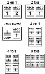Combinaison | Non, 2 en 1, 2 en 1 (Invers.), 4 en 1, 4 en 1 (Invers.), 6 en 1, 6 en 1 (Invers.), 8 en 1, 8 en 1 (Invers.), 9 en 1, 9 en 1 (Invers.), 16 en 1, 16 en 1 (Invers.) | Combinaison de plusieurs pages sur une feuille de papier pour l'impression. |