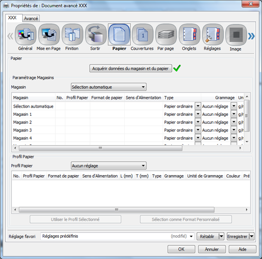 Acquérir données du magasin et du papier | - | Acquisition des informations magasin et profils papier définis sur la machine.