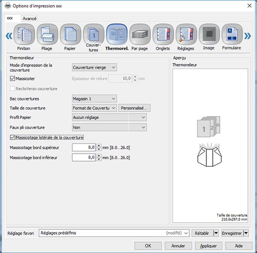 Massicoter | Non, Oui | Pour massicoter la couverture de thermoreliure, sélectionnez ce réglage. |