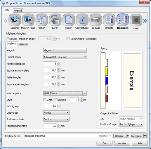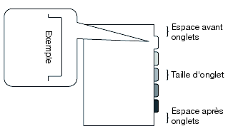 Format papier | A4 Bord Long Onglet 12,7 mm, A4 Bord Long Onglet 15,0 mm, A4 Bord Court Onglet 12,7 mm, A4 Bord Court Onglet 15,0 mm, Letter Bord Long Onglet, Letter Bord Court Onglet | Sélectionnez le format papier d'un onglet. |