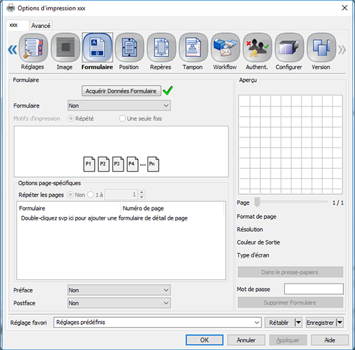 Répéter les pages | Non, 1 à 9999 | Cette option répète la configuration page selon le nombre de fois spécifié. |