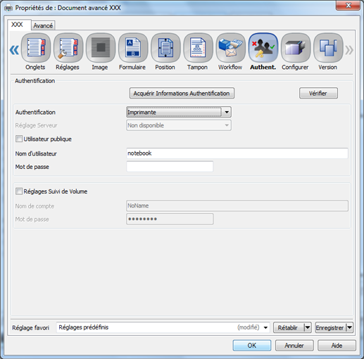 Un clic sur Acquérir Informations Authentification affiche les informations configurées dans le réglage Authentification utilisateur/Compte Département de la machine, vous permettant d'entrer uniquement les éléments voulus.