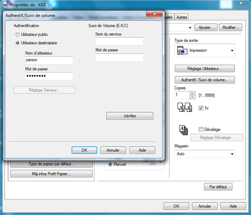 Si le nom d'utilisateur entré est activé sur la machine, la tâche est imprimée et imputée à l'utilisateur spécifié.