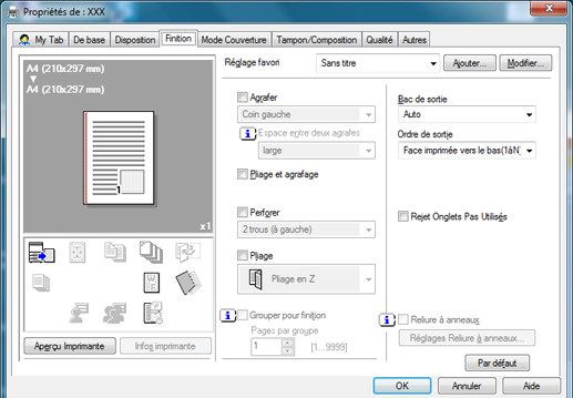Rainage | Non, Oui | Des rainages pour le pliage du papier sont effectués pour empêcher le toner de se décoller quand le papier est en cours de pliage. Spécifiez le côté rainage dans la liste déroulante. Les détails peuvent être configurés dans Configuration du rainage. |