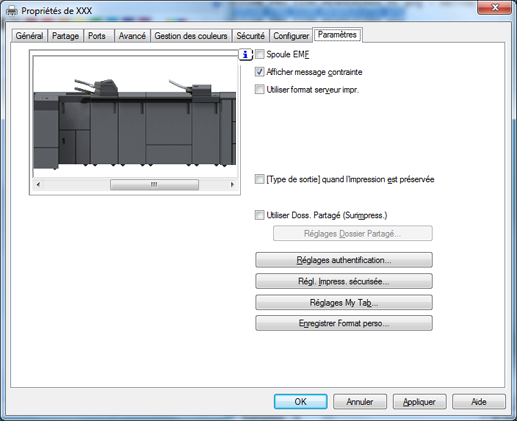 Spoule EMF | Pour activer le métafichier spoule (EMF), utilisez ce réglage. Si vous activez ce réglage lorsque Authentification ou Compte Département est défini, vous ne pouvez pas imprimer. |