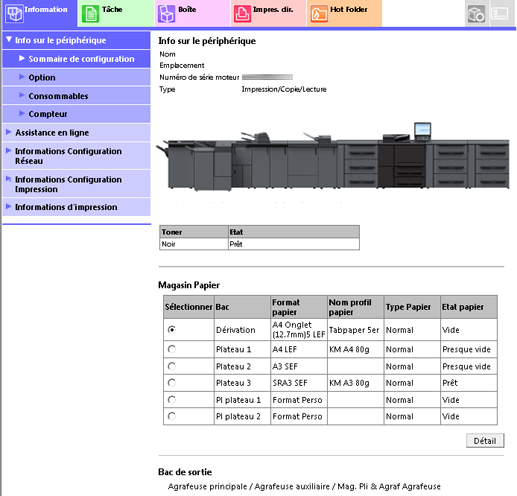 Info sur le périphérique | Permet de vérifier les composants, options, consommables et compteurs de la machine. |