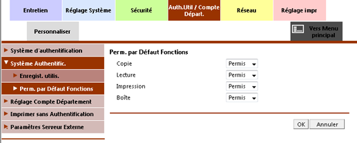Pour afficher cet écran, cliquez sur Système Authentific. - Perm. par Défaut Fonctions dans le menu de l'onglet Auth.Util / Compte Départ. Ce réglage est disponible uniquement si vous réglez l'authentification utilisateur sur Activé (serveur externe).