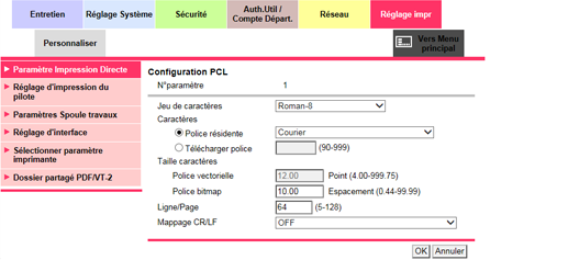 Vous pouvez aussi effectuer ce réglage sous Contrôleur sur l'écran UNITÉ PRINC. Pour en savoir plus sur le réglage, voir Configuration PCL.