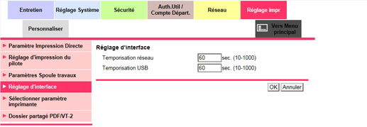 Cliquez sur Réglage d'interface dans le menu de l'onglet Réglage impr pour afficher cet écran. Vous pouvez aussi effectuer ce réglage sous Contrôleur sur l'écran UNITÉ PRINC. Pour en savoir plus sur le réglage, voir Délai avant déconnexion I/F.