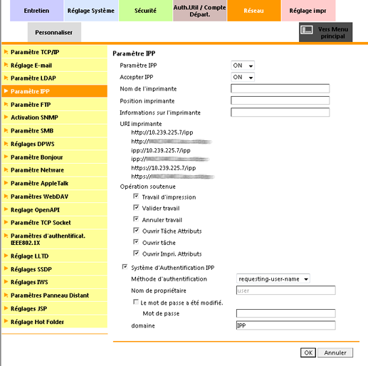 Cliquez sur Paramètre IPP dans le menu de l'onglet Réseau pour afficher cet écran.