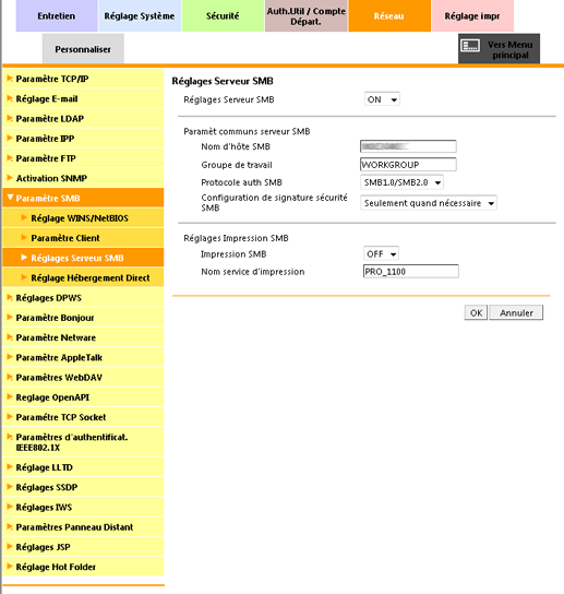 Pour utiliser la machine comme serveur SMB, sélectionnez Oui dans la liste déroulante Réglages Serveur SMB.