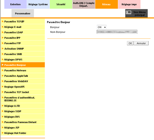 Cliquez sur Paramètre Bonjour dans le menu de l'onglet Réseau pour afficher cet écran.