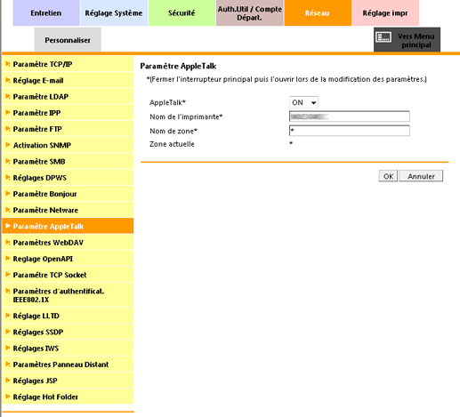 Pour afficher cet écran, cliquez sur Paramètre AppleTalk dans le menu de l'onglet Réseau.