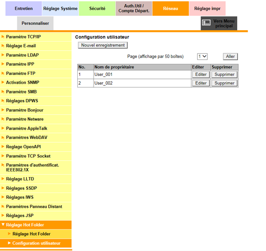 Pour afficher cet écran, cliquez sur Réglage Hot Folder - Configuration utilisateur dans le menu de l'onglet Réseau.