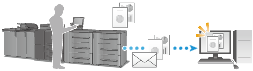 Vous pouvez envoyer des données numérisées depuis l'ADF ou de la vitre d'exposition (données numérisées) à une adresse e-mail sous forme de fichier joint.