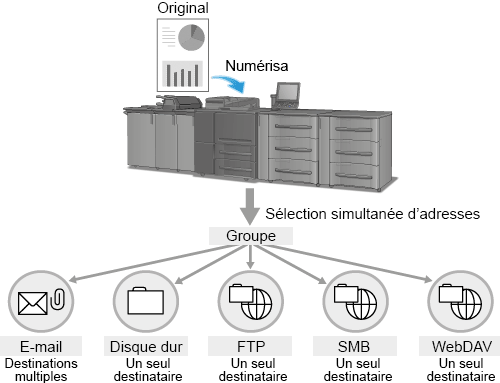 Si vous enregistrez plusieurs destinations en tant que groupe, vous pouvez y envoyer ou enregistrer en même temps les données numérisées dans l'ADF ou sur la vitre de numérisation (données numérisées).