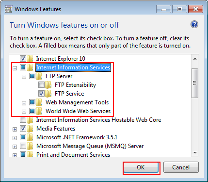 Cliquez sur Internet Information Services et Service FTP et cliquez ensuite sur OK.