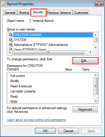 Cliquez sur l'onglet Sécurité et sur Modifier.
