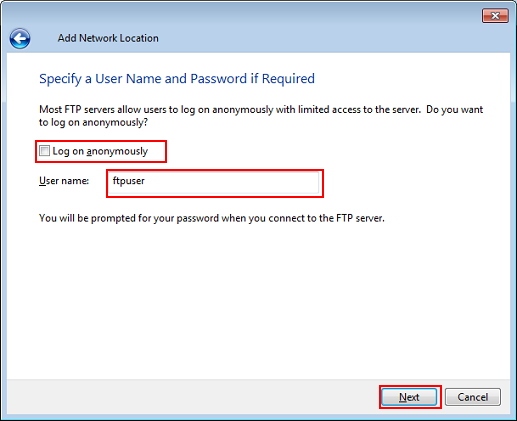 Décochez Ouvrir une session anonyme et entrez le nom d'utilisateur et cliquez ensuite sur Suivant.