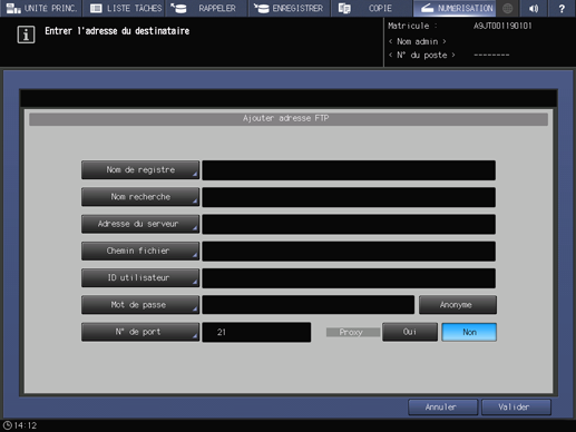 Explication supplémentairePour utiliser un serveur proxy pour l'envoi au serveur FTP, réglez Proxy sur ON. Dans ce cas, configurez un réglage serveur proxy dans UTILITAIRES au préalable. Pour en savoir plus sur Configuration réseau, voir Configuration NIC.