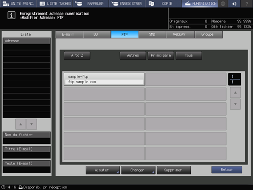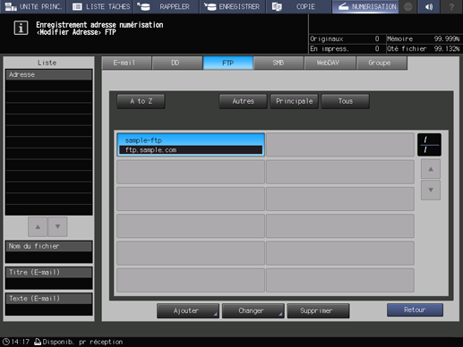 Enregistrez le site FTP de destination sur l'écran tactile de la machine.