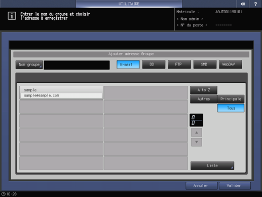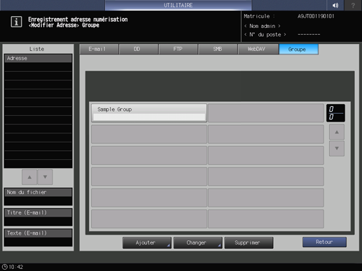 condition préalableVous pouvez enregistrer plus d'une destination par groupe pour l'envoi d'e-mails. Vous ne pouvez enregistrer qu'une destination dans un groupe de chacun des éléments DD, FTP, SMB et WebDAV.