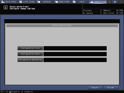 Appuyez sur Valider à l'écran Saisie option E-mail pour retourner à l'écran NUMÉRISATION.