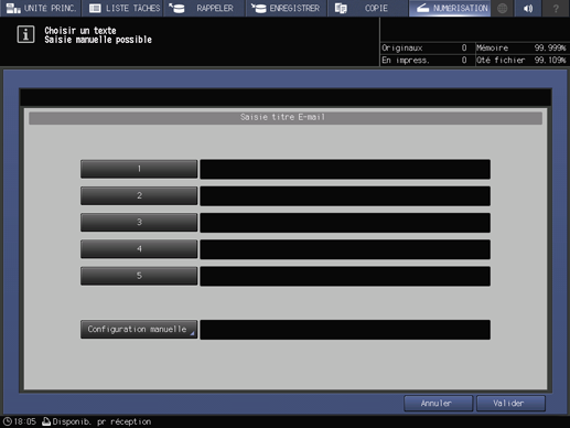 Pour définir un titre d'e-mail, appuyez sur Configuration titre, sur 1 à 5 ou sur Configuration manuelle. Définissez le titre et appuyez sur Valider.