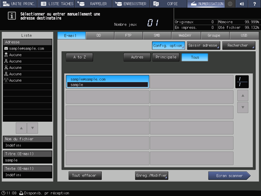 Explication supplémentaireLa liste des adresses e-mail est affichée par défaut. Pour en savoir plus sur l'onglet Destination par défaut de l'écran NUMÉRISATION, voir Config. administrateur : Configuration de la numérisation.
