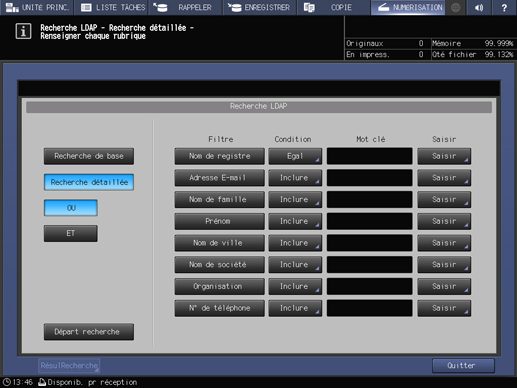 Pour effectuer une recherche LDAP, la configuration LDAP est nécessaire. Pour des détails, voir Onglet Réseau : configuration LDAP.