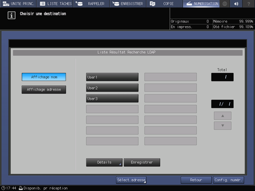 Vous pouvez acquérir les informations correspondant aux critères de recherche entrés sur le panneau de contrôle à partir de la base de données du serveur LDAP. Vous pouvez aussi sélectionner l'adresse e-mail acquise et envoyer ou enregistrer les données de numérisation.