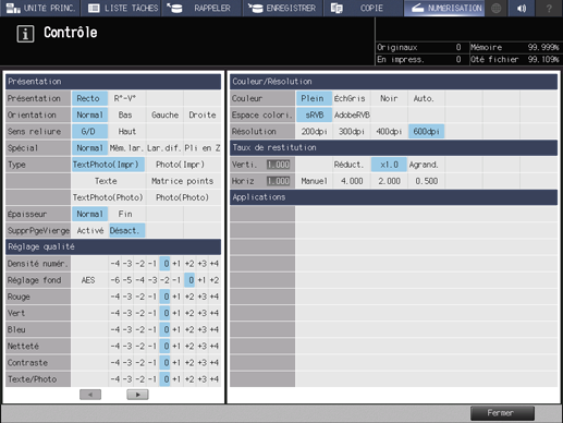 • Explication supplémentaireLes paramètres actuels de Présentation, Réglage qualité et Format numérisation du côté gauche de l'écran Contrôle.