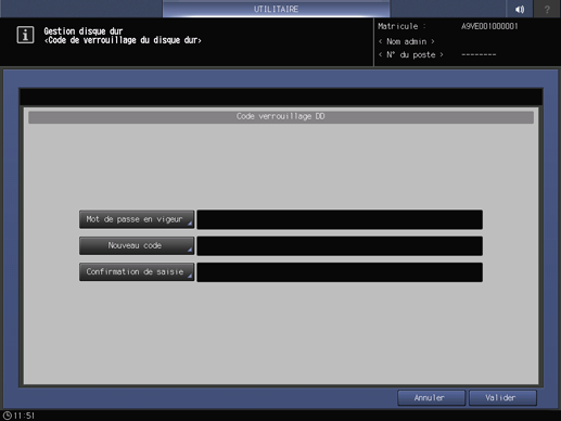 Appuyez sur l'onglet Configuration sécurité de l'écran Menu Réglage administrateur et appuyez consécutivement sur Gestion disque dur et Code verrouillage DD.