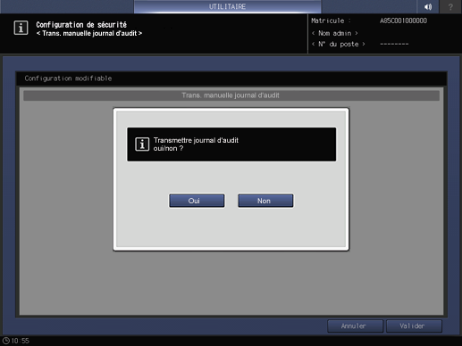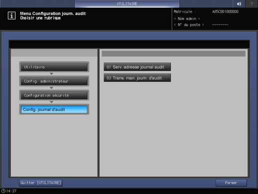 Sur l'écran Menu configuration administrateur, Appuyez sur Configuration sécurité - Configuration journal d'audit - Trans. man. journ. d'audit.