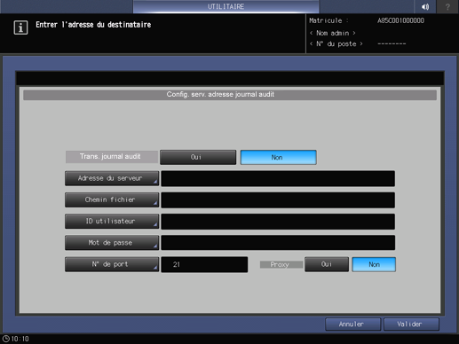 Dans l'écran Menu configuration administrateur Menu, appuyez sur Configuration sécurité - Configuration journal d'audit - Serveur d'adresse du journal d'audit.