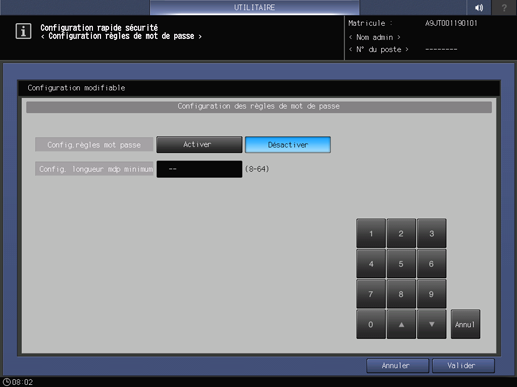 Sélectionnez Activer ou Désactiver pour Config.règles mot passe. Si vous sélectionnez Activer, spécifiez le nombre de caractères pour Définir longueur minimum mot passe entre 8 et 64.
