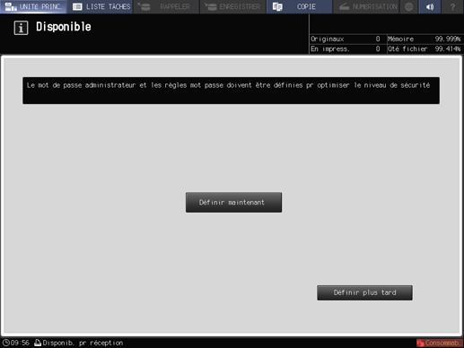 • Explication supplémentaireSi vous sélectionnez Définir maintenant, l'écran Conf.sécu.rapide s'affiche. Contactez l'administrateur de la machine. Lorsque vous appuyez sur Fermer, l'écran par défaut s'affiche et vous pouvez continuer d'utiliser la machine normalement.