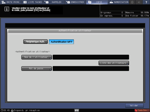 condition préalableVous pouvez définir l'utilisation de cartes IC sur la machine pour l’authentification utilisateur. Dans ce cas, les utilisateurs peuvent s'authentifier également en entrant un Nom de l'utilisateur et un Mot de passe utilisateur.