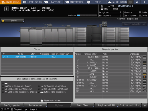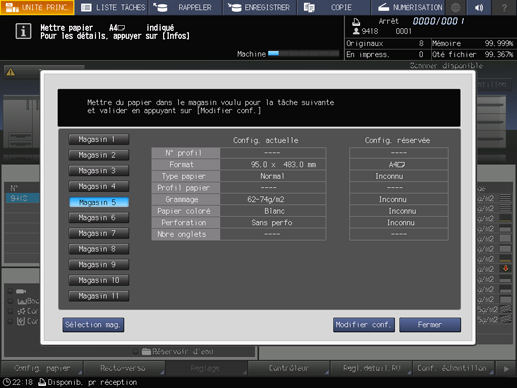 Remplacez les réglages papier d'un autre magasin (sélection actuelle) par ceux requis par les données d'impression (configuration réservée). Approvisionnez le magasin conformément aux modifications de réglage apportées et lancez l'impression.