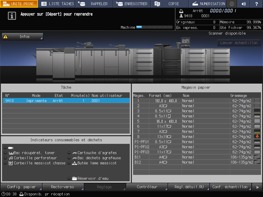 Le réglage papier du magasin sélectionné (sélection actuelle) et celui requis par les données d'impression (sélection réservée) sont affichés.