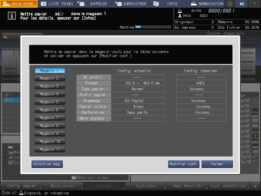 Lorsque le message affiché désigne un magasin spécifique, remplacez la configuration papier du magasin (sélection actuelle) par celle requise par les données d'impression (configuration réservée). Approvisionnez le magasin de papier conforme aux conditions spécifiées, puis lancez l'impression.